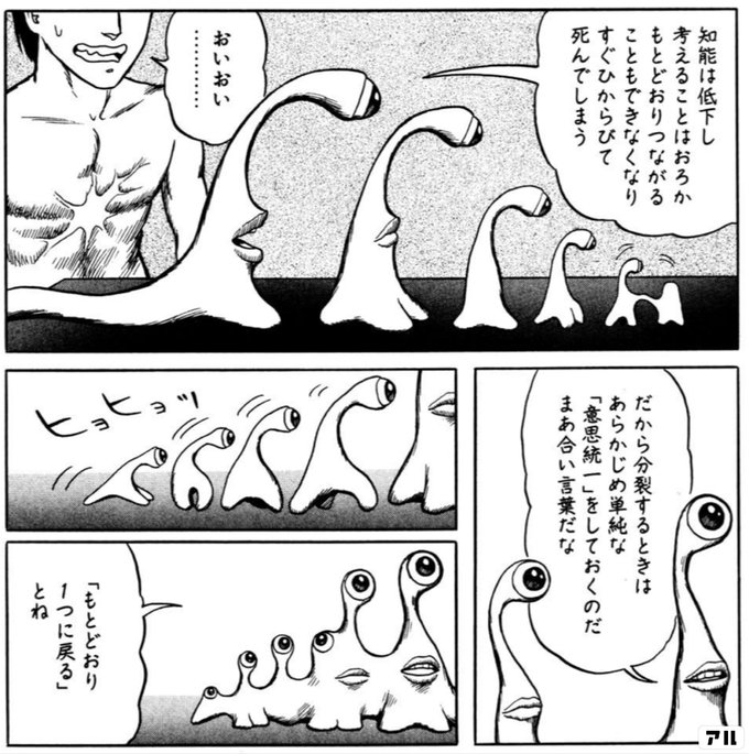 知能は低下し 考えることはおろか もとどおりつながることもできなくなり すぐひからびて死んでしまう おいおい だから分裂するときは あらかじめ単純な 意思統一 をしておくのだ まあ合言葉だな ヒョヒョッ もとどおり1つに戻る とね 寄生獣 アル